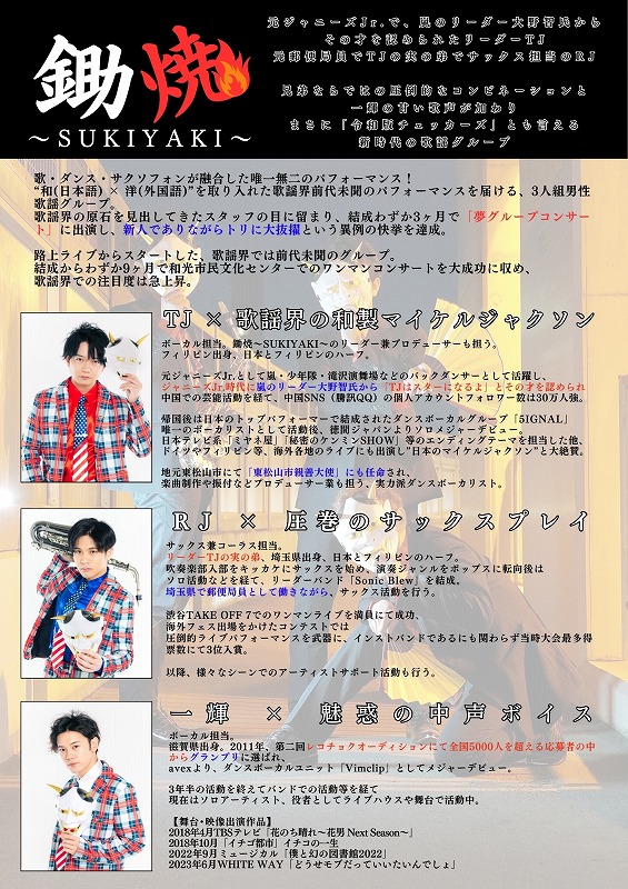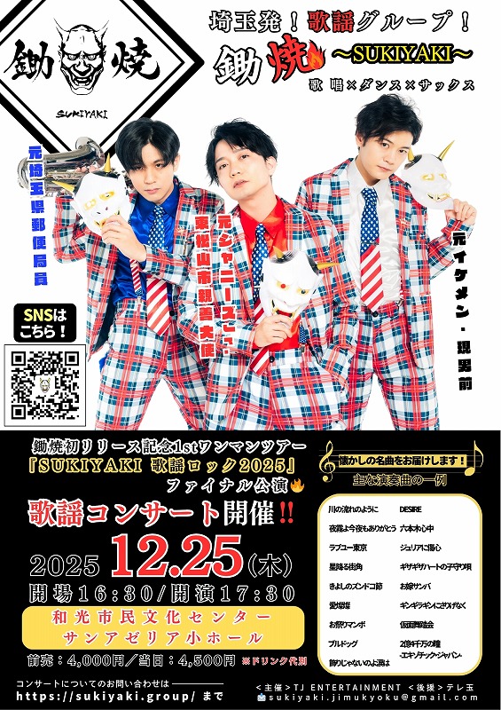 埼玉発歌謡グループ「鋤焼~SUKIYAKI~」が歌・ダンス・サックスで織りなす唯一無二の歌謡コンサート。