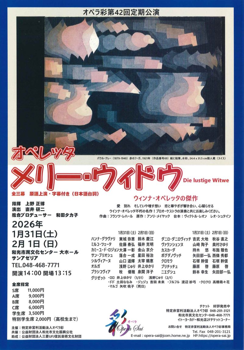 【発売開始日の取り扱い開始時間】発売場所開始時間サンアゼリア窓口10:00イトーヨーカドー和光店2Fサンアゼリアチケットコーナー13:00電話予約(サンアゼリア 048-468-7771)主催:特定非営利活動法人オペラ彩