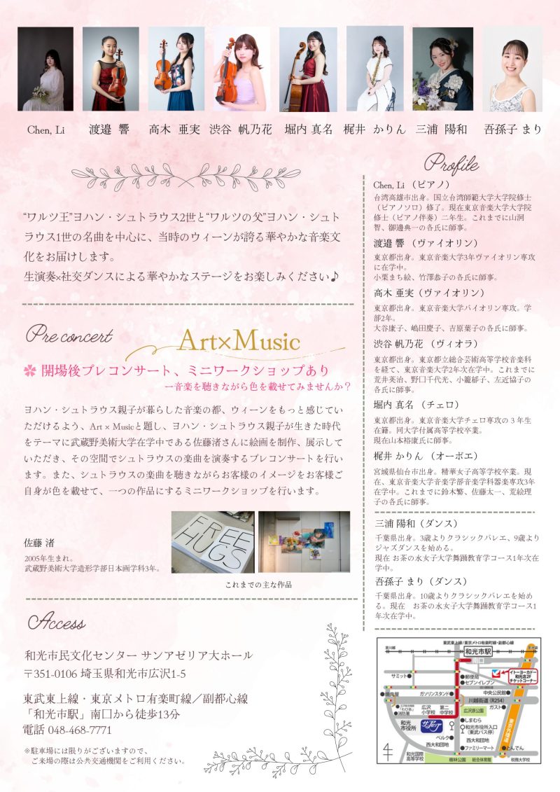ヨハン・シュトラウス親子が暮らした音楽の都ウィーンをもっと感じていただけるよう、Art&Musicと題し、ヨハン・シュトラウス親子が生きた時代をテーマに武蔵野美術大学在学中である佐藤渚さんに絵画を制作、展示していただき、その空間でシュトラウスの楽曲を演奏するプレコンサートを行います。
