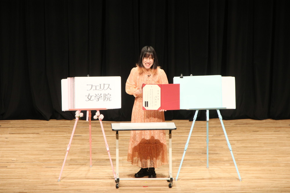 冒頭の今話題の卒業証書ネタから、8月に事実婚されたことに絡めた結婚ネタまで、観客のツボを押さえた内容で笑いを誘いました。